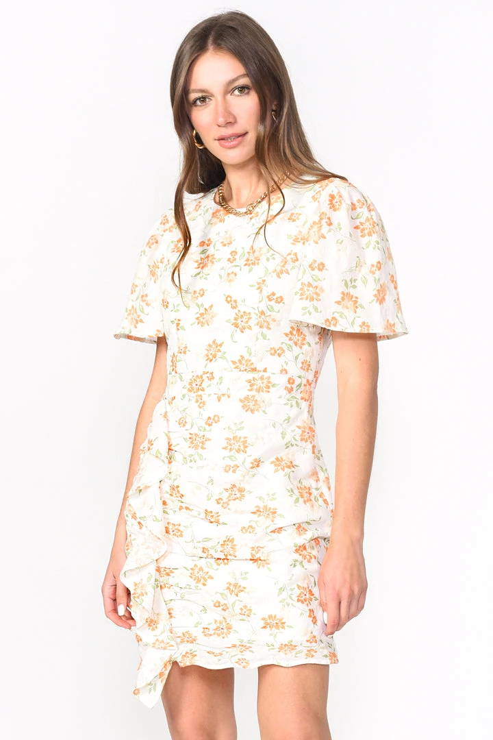 Meet our newest crush – the Alicia Floral Dress. This floral and feminine dress features flowy short sleeves, a ruched skirt with cascading ruffle detail, smocking along back waistband, and is finished with a cut-out open back with a baby hook and eye closure. Invisible zipper along back.