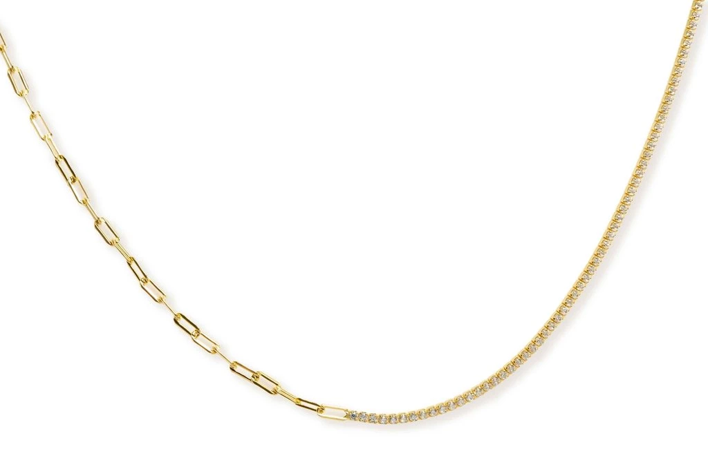 Beautiful tiny cubic zirconia half strand mixed with tiny paper clip link strand. Our Avery necklace can be worn alone or layered with your faves.Â