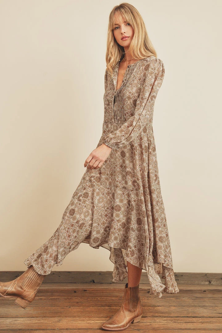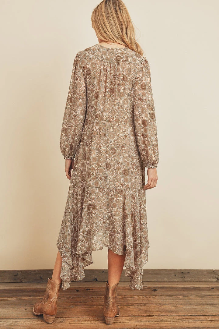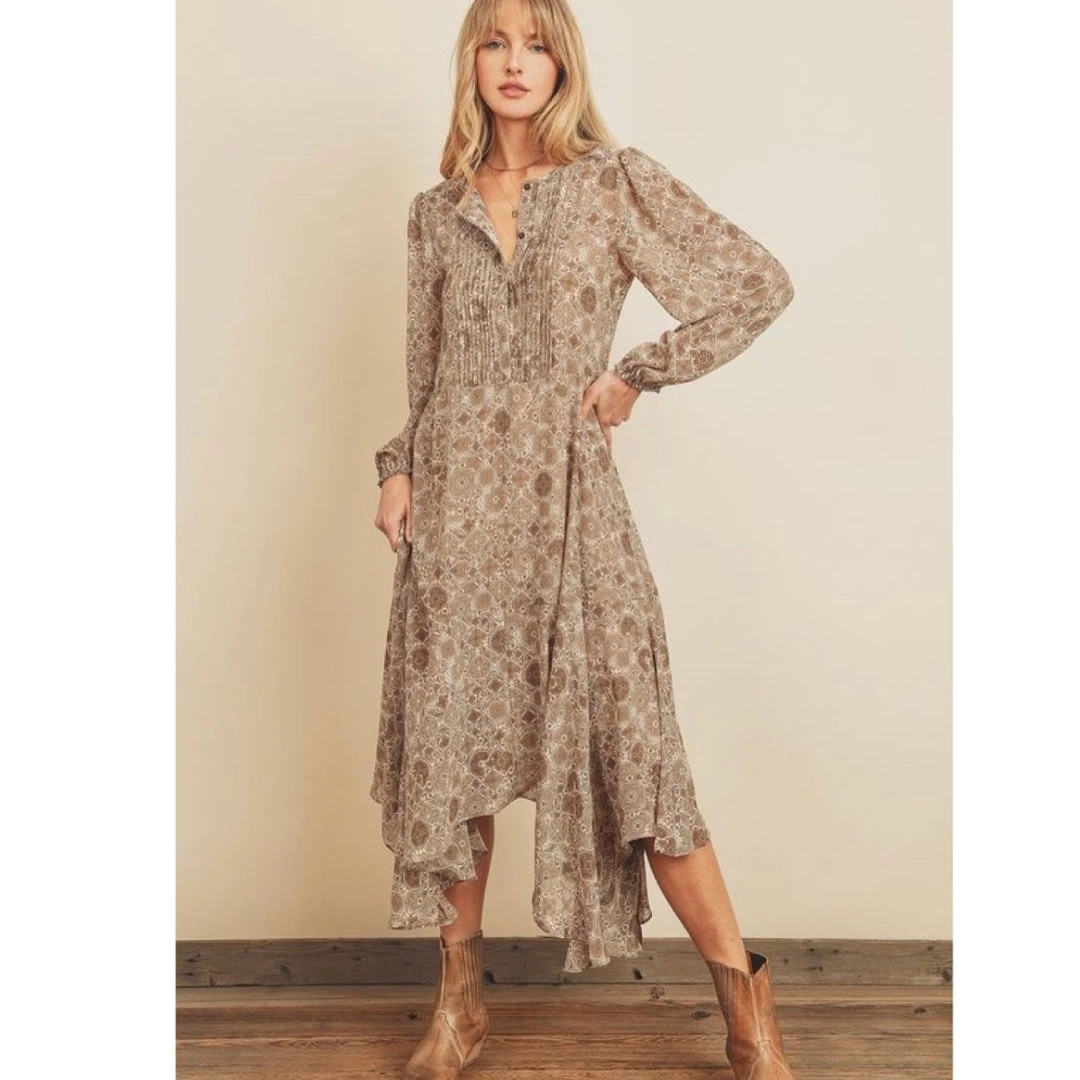 Description: This boho print midi dress features a handkerchief hem, cinched detailing along the button closure, and long sleeves with elastic cuffs. Partially lined. Model is 5`9 and wearing size Small.