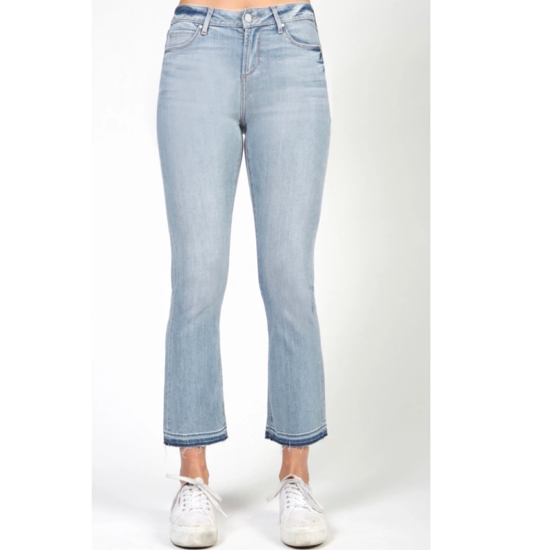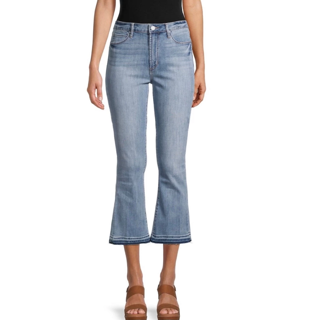 A cropped pair of jeans with a high-rise falls to a flared leg.