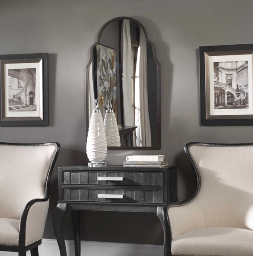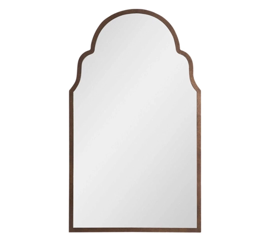 This shaped mirror features a hand forged metal frame finished in lightly textured, dark brown with burnished edges and gold highlights.