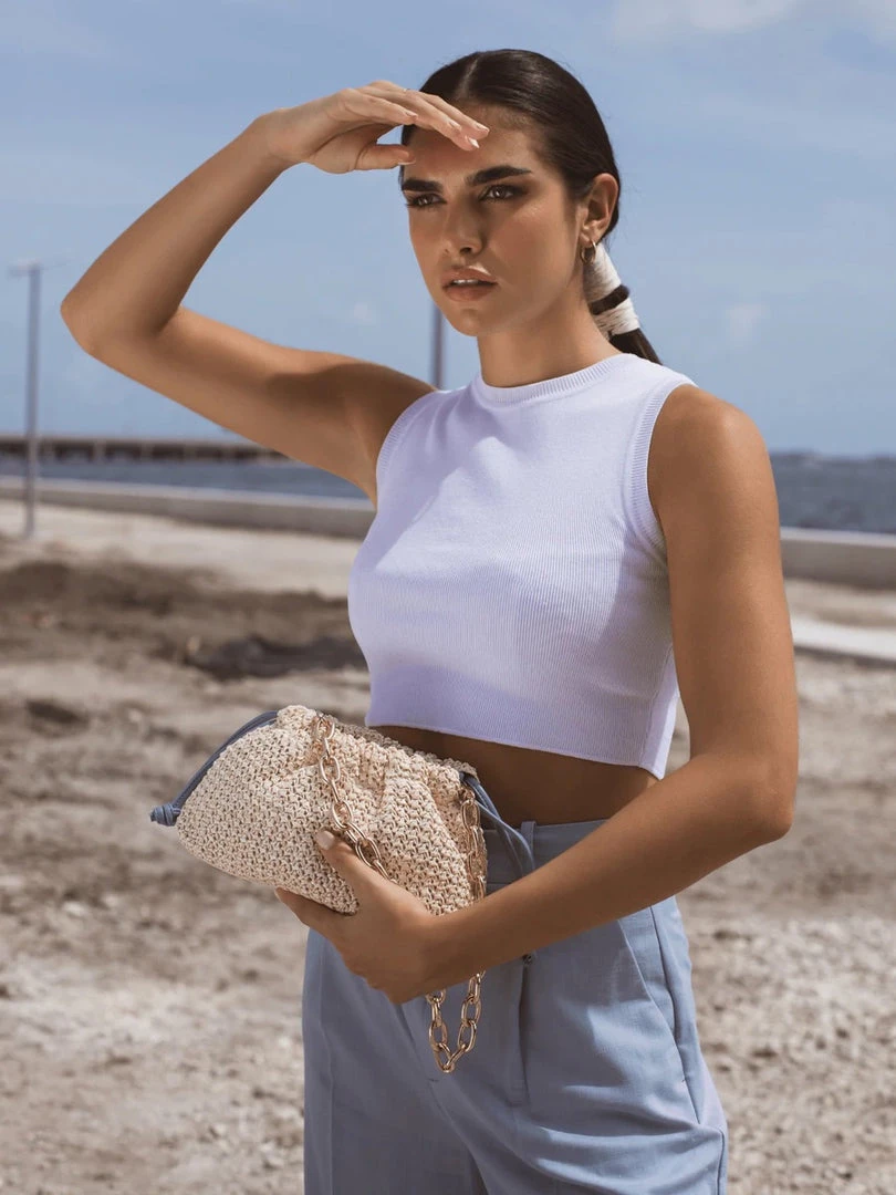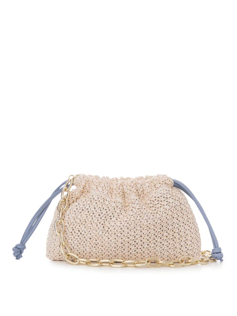 The Brea Bag just got a bigger sister! The Brea Large is everything you love about our classic brea bag but with a few twists! This stunning bag is a little larger making it the ideal size to fit everything you need when leaving the house! This incredible bag is now available with the perfect straw body! Accented with a stunning removable gold chain link! The body of the bag is crafted with a classic straw body accented with buttery soft vegan leather drawstrings! Remove the chain and carry this elegant bag as a clutch making it simple & easy to transition your look!