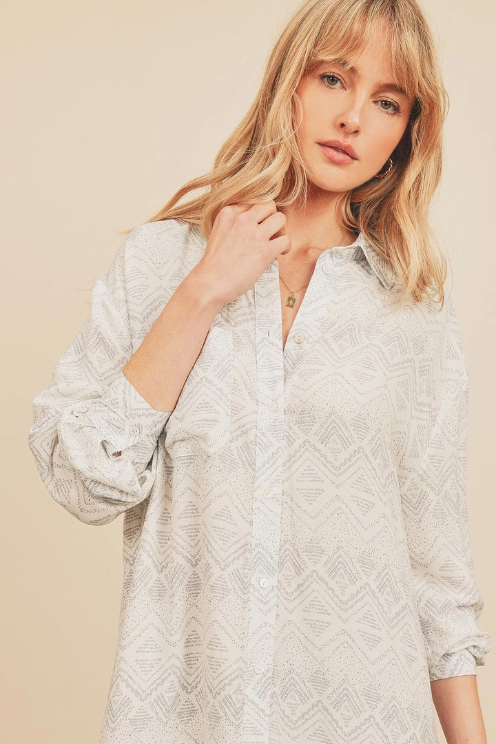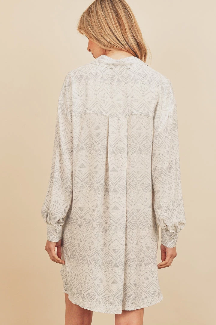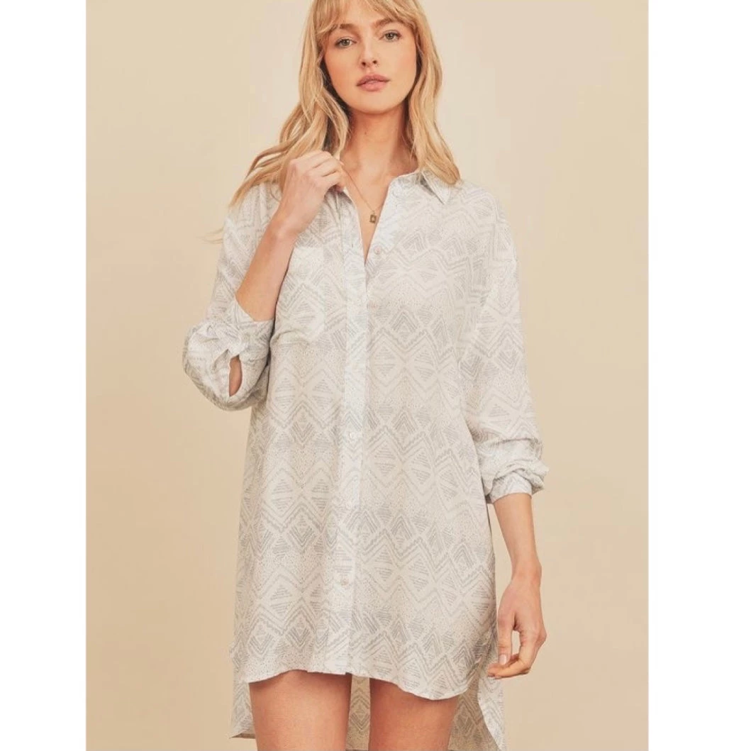 Description:print button down shirt dress featuring a front patch pocket and high-low hem. Model is 5`9 and wearing size Small.