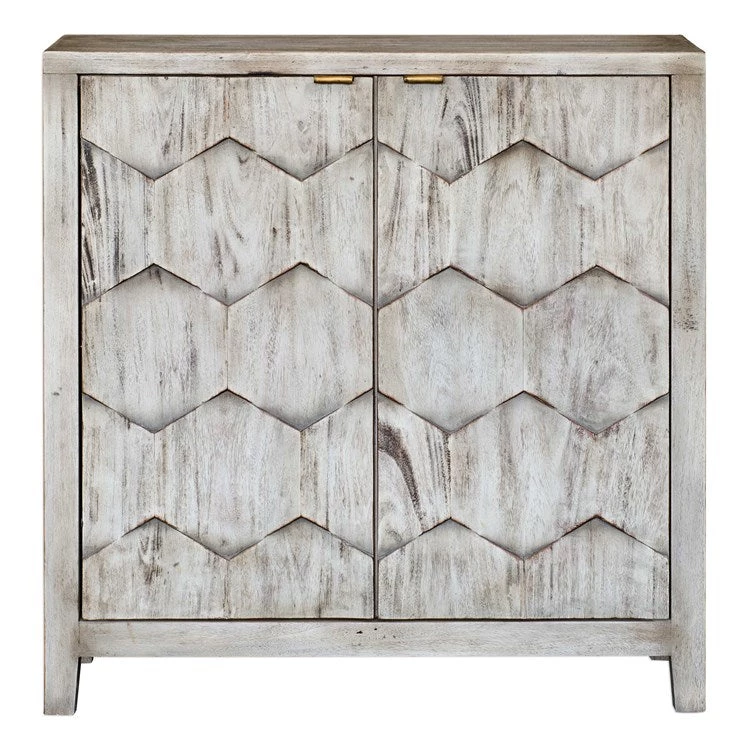 Expert craftsmanship is displayed in the 3-dimensional honeycomb striped doors in smoked ivory finished mahogany wood with antique bronze iron handles. Includes one adjustable interior shelf.