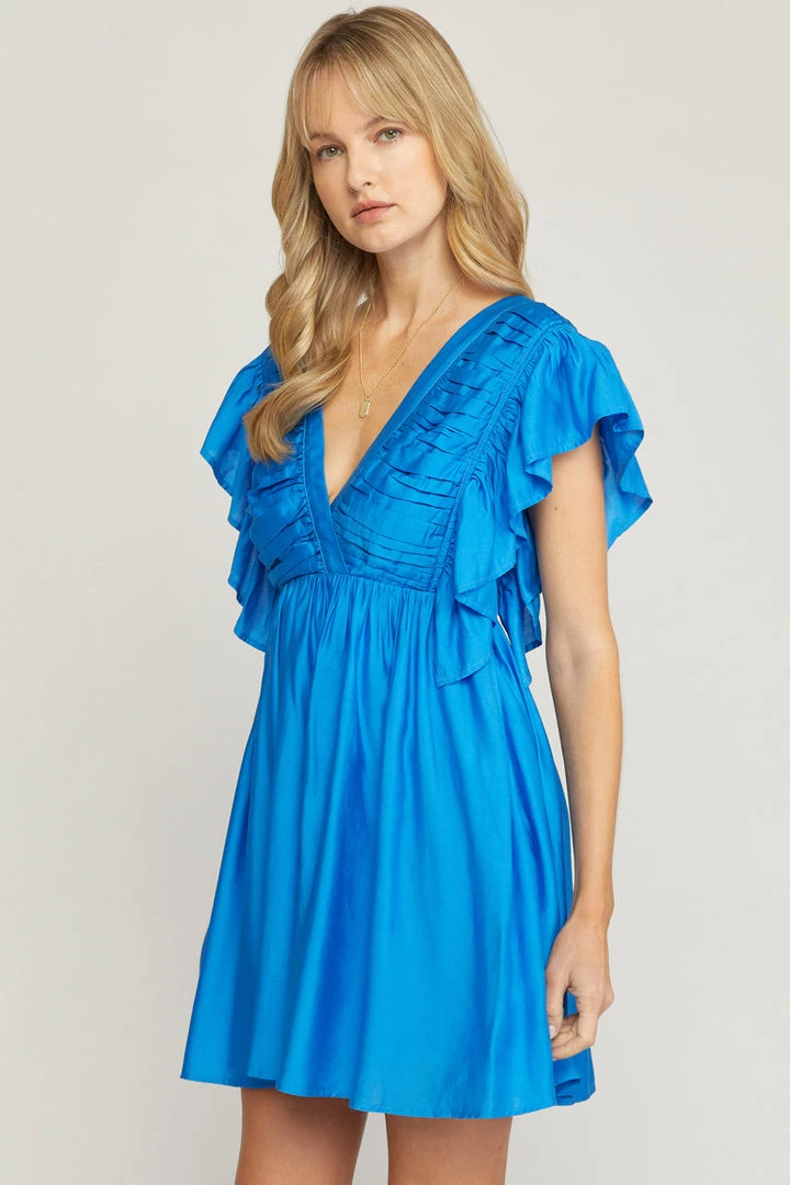 Cobolt Blue Ruffle shoulder dress with ruching and tie back detail