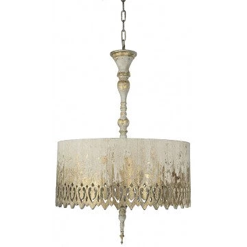 Distressed Cream & Gold Metal Pendant Light with Carved Wood Shade. Fixture includes 4 sockets for standard 60 watt bulbs.