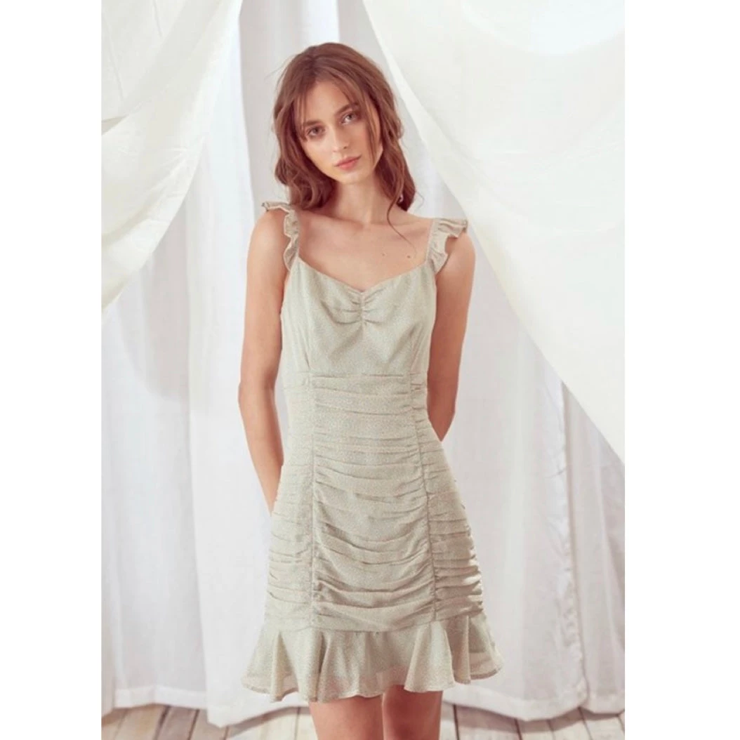 It features fluttered ruffled fixed straps, a slight v neck, and center chest ruching.