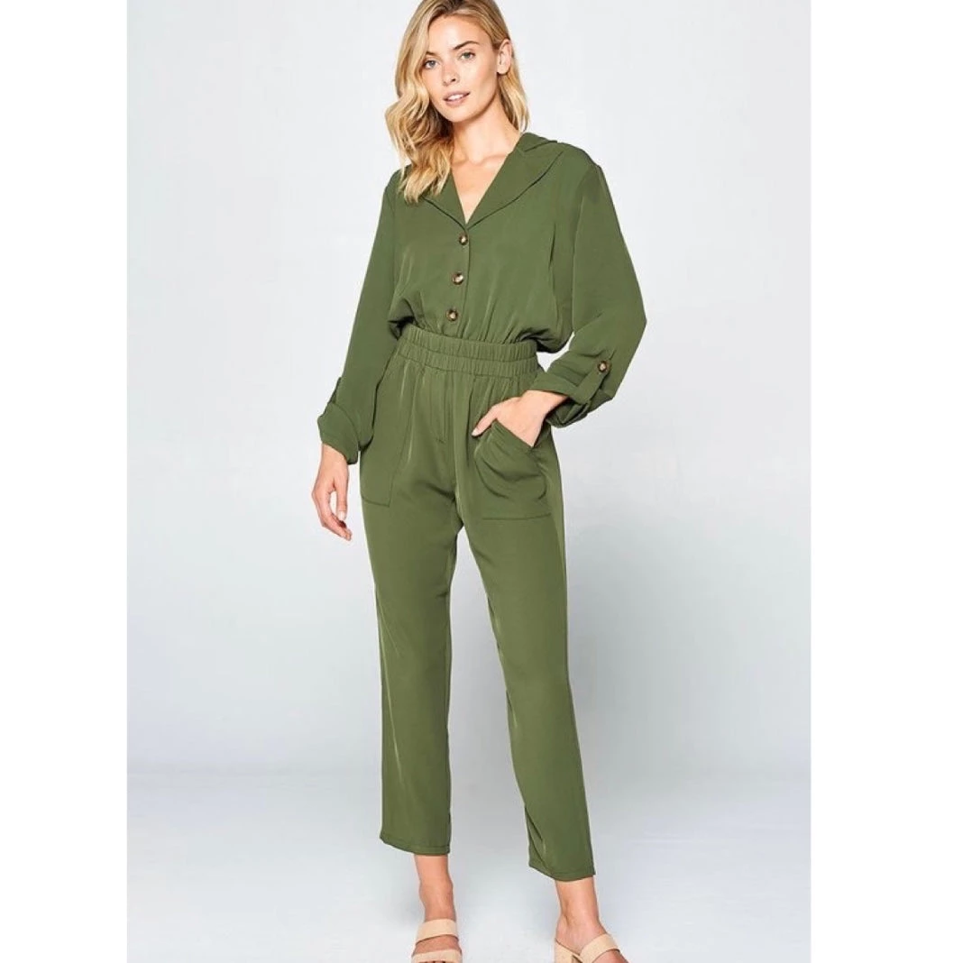 Description: The Falino long sleeve elastic waistband coverall jumpsuit in slight shimmer woven fabric. This utilitarian jumpsuit features long sleeves, peak lapel with collar, adjustable tab sleeves, tortoise button up, and an elasticated waist band.
