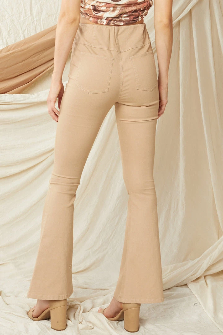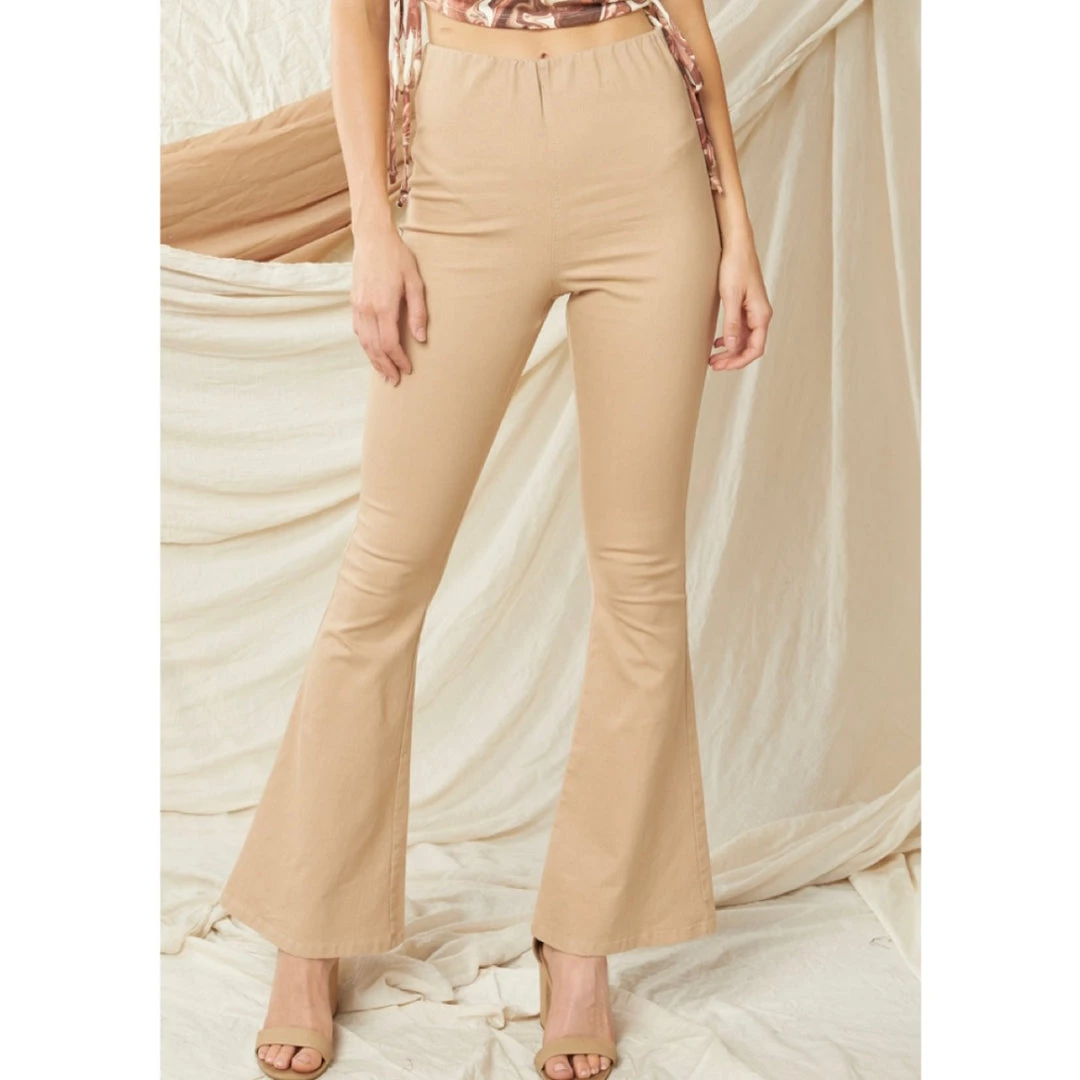 Solid high waisted flare leg pants featuring pockets at back. Elastic band at waist. Unlined. Knit. Non-sheer. Lightweight.