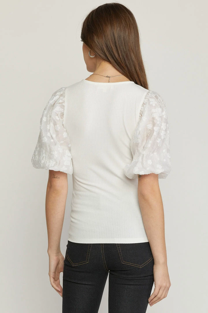 Solid ribbed v-neck half sleeve top featuring contrast floral bubble sleeve. Unlined. Knit. Non-sheer. Lightweight.