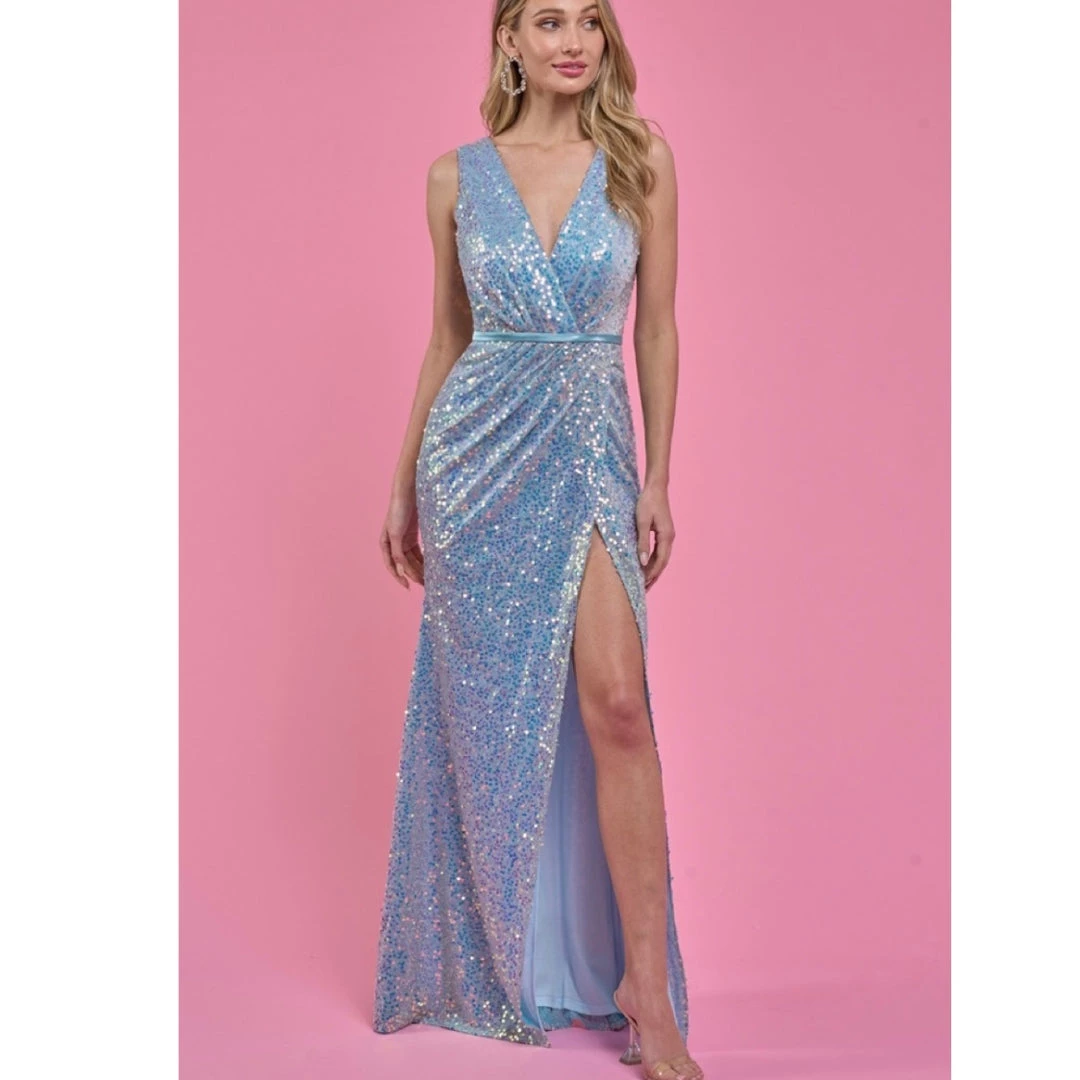 Description: – LADIES SLEEVELESS SEQUIN SLIT SIDE MAXI DRESS