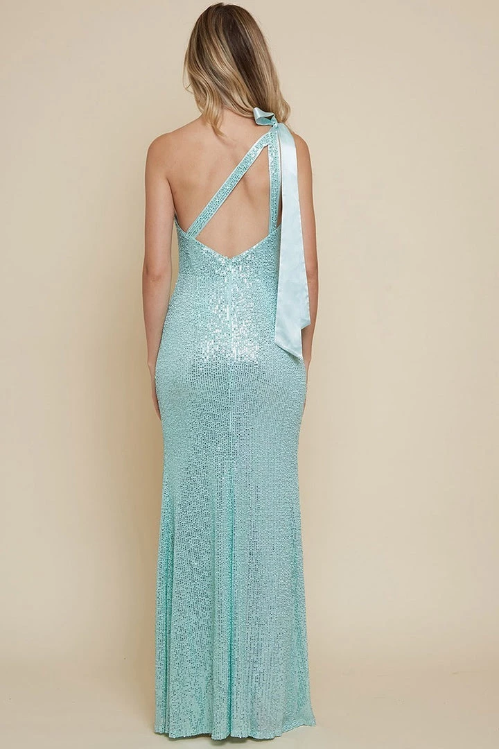 Description: – LADIES SEQUIN SLIT MAXI DRESS W/TIE ONE SHOULDER