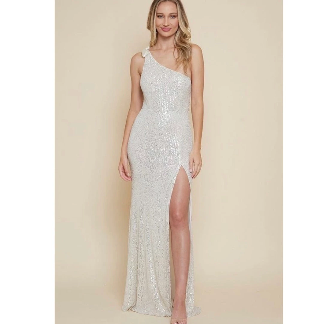 Description: – LADIES SEQUIN SLIT MAXI DRESS W/TIE ONE SHOULDER