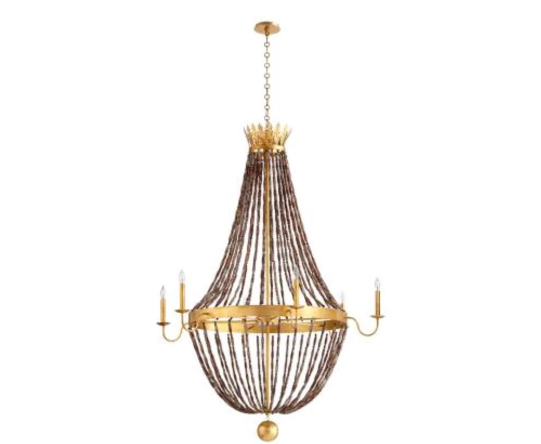 Quickly transform the look and feel of your home with this commanding six-light gold leaf chandelier. Beautiful beaded strands are worked into a voluminous shape that helps give this fixture a dramatic silhouette. Gorgeous golden trims and a matching crown-like leaf-lined top accent bring an air of sophistication to this stunning chandelier.