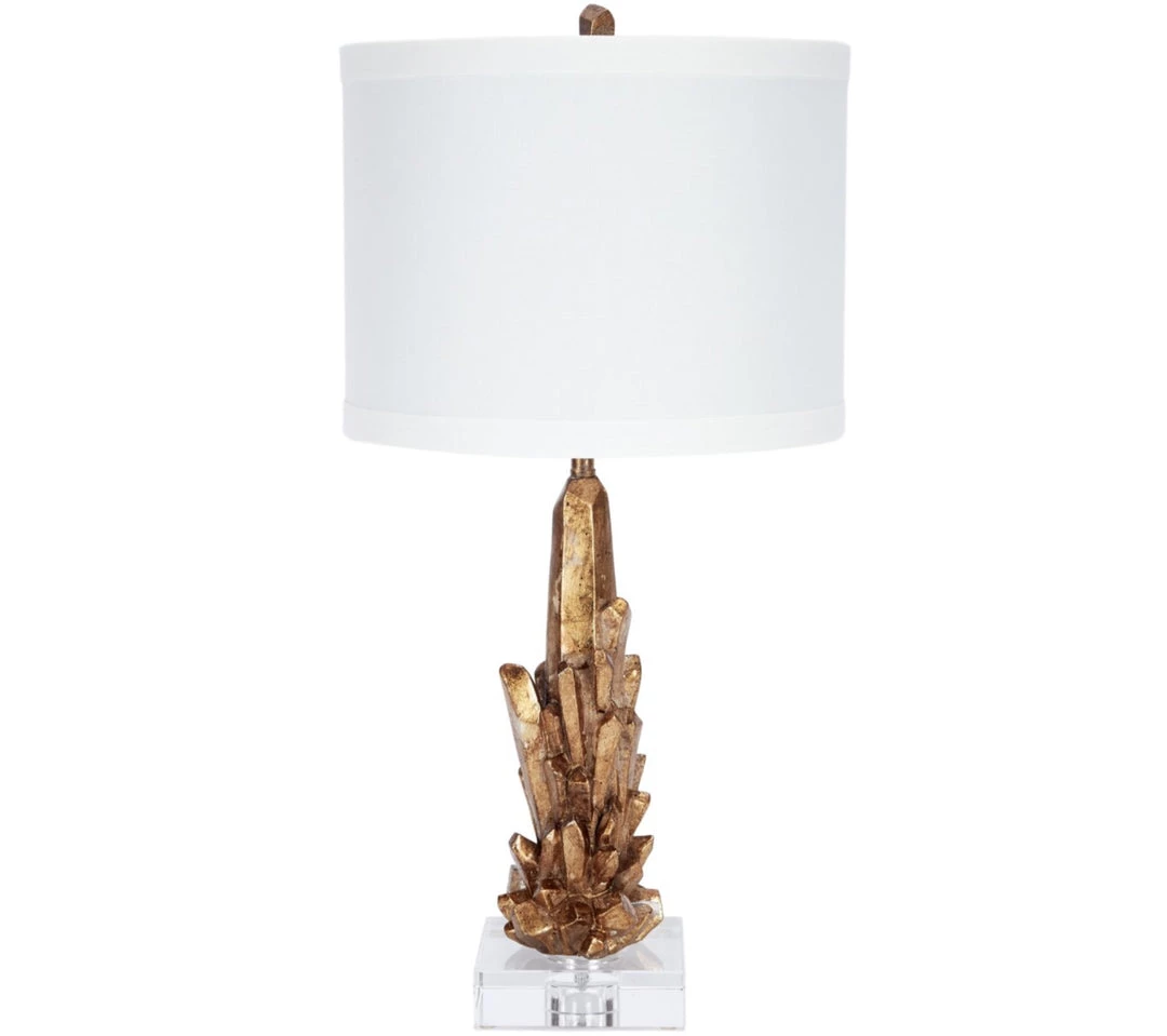BELLE ANTIQUE GOLD FAUX CRYSTAL TABLE LAMP WITH BANDED WHITE LINEN SHADE