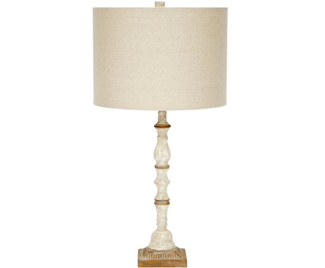FRENCH WHITE & AGED GOLD LIDIA LAMP WITH LIGHT LINEN SHADE