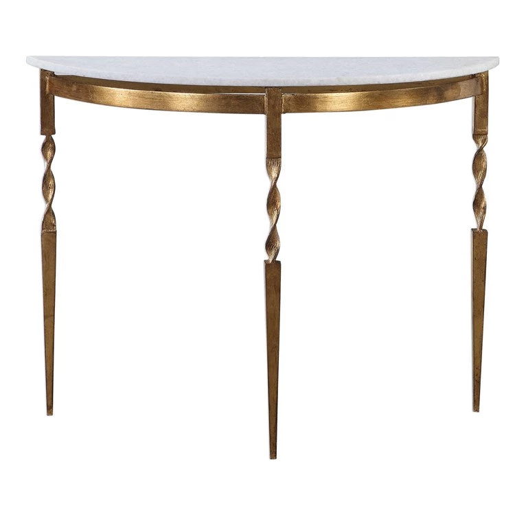 Elegant in design, this demilune console table features a polished, white marble top. The solid cast iron base is accented with twist details and tapered legs in a heavily antiqued gold finish.