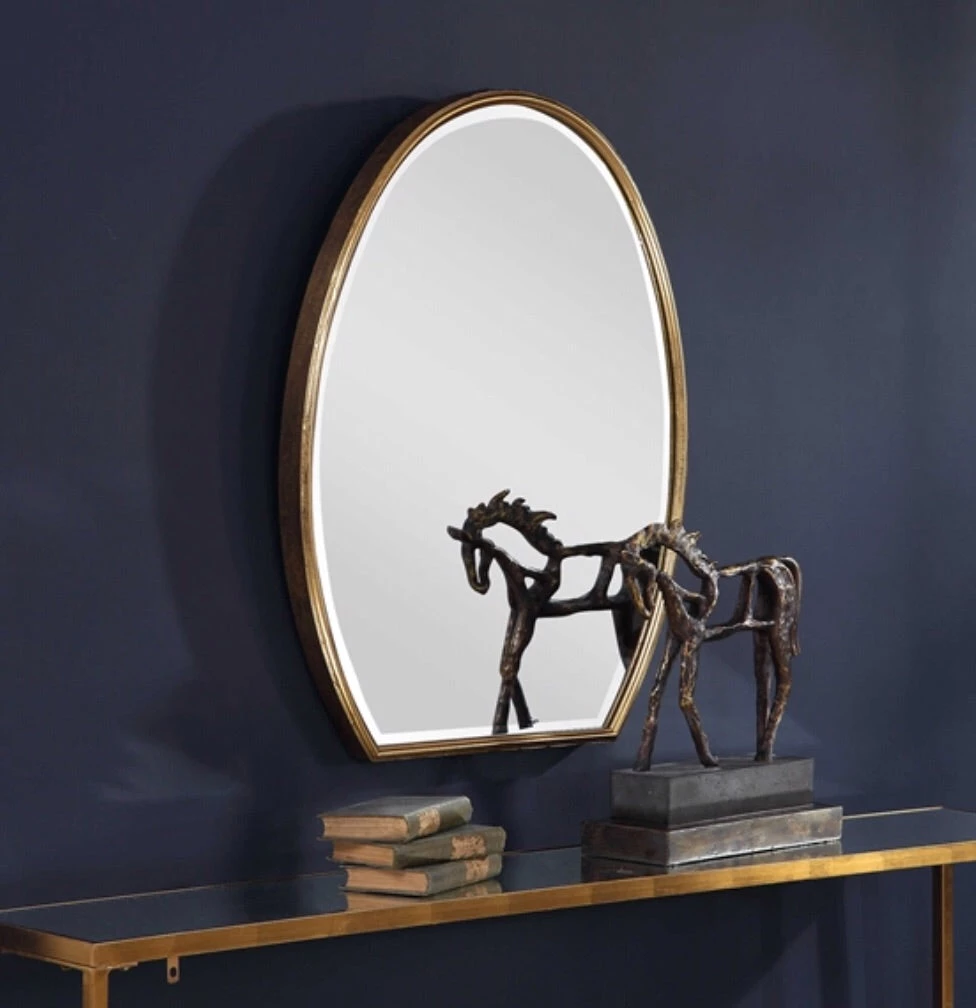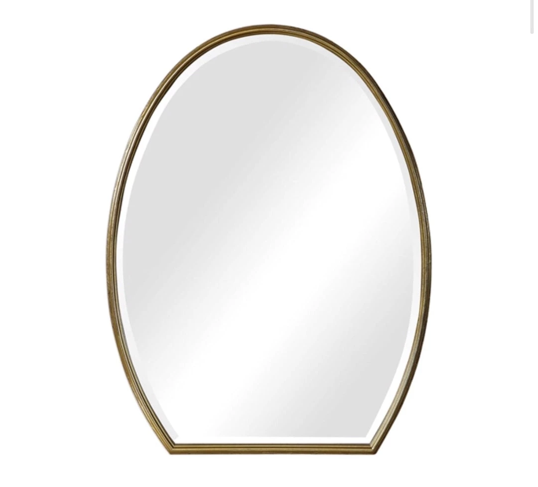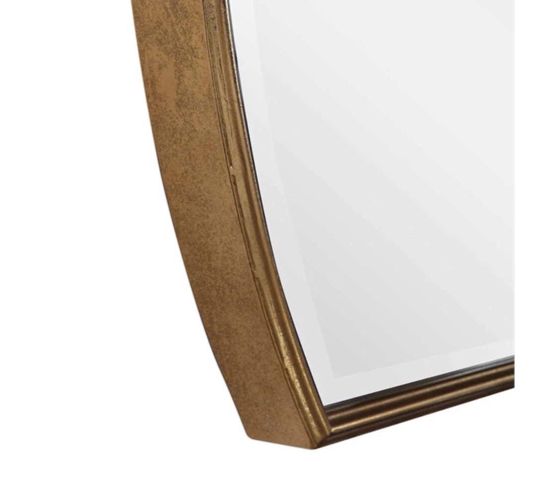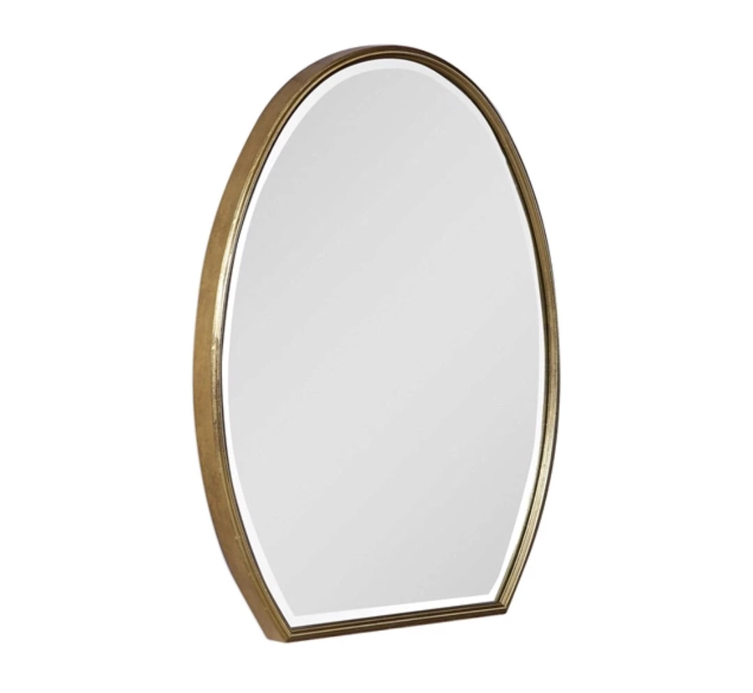 This modified oval-shaped mirror is fashioned with a gracefully curved iron frame featuring a scalloped profile that’s finished in a hand applied gold leaf. A generous 1 1/4″ bevel surrounds the mirror.