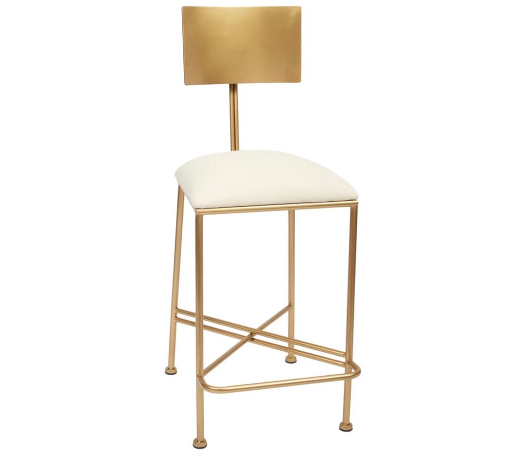 GOLD COUNTER HEIGHT BARSTOOL WITH METAL BACK AND LIGHT LINEN CUSHION