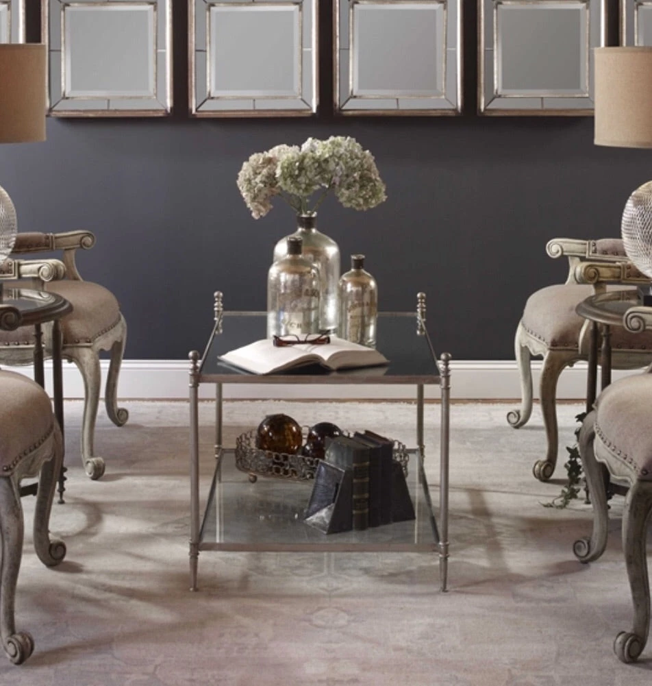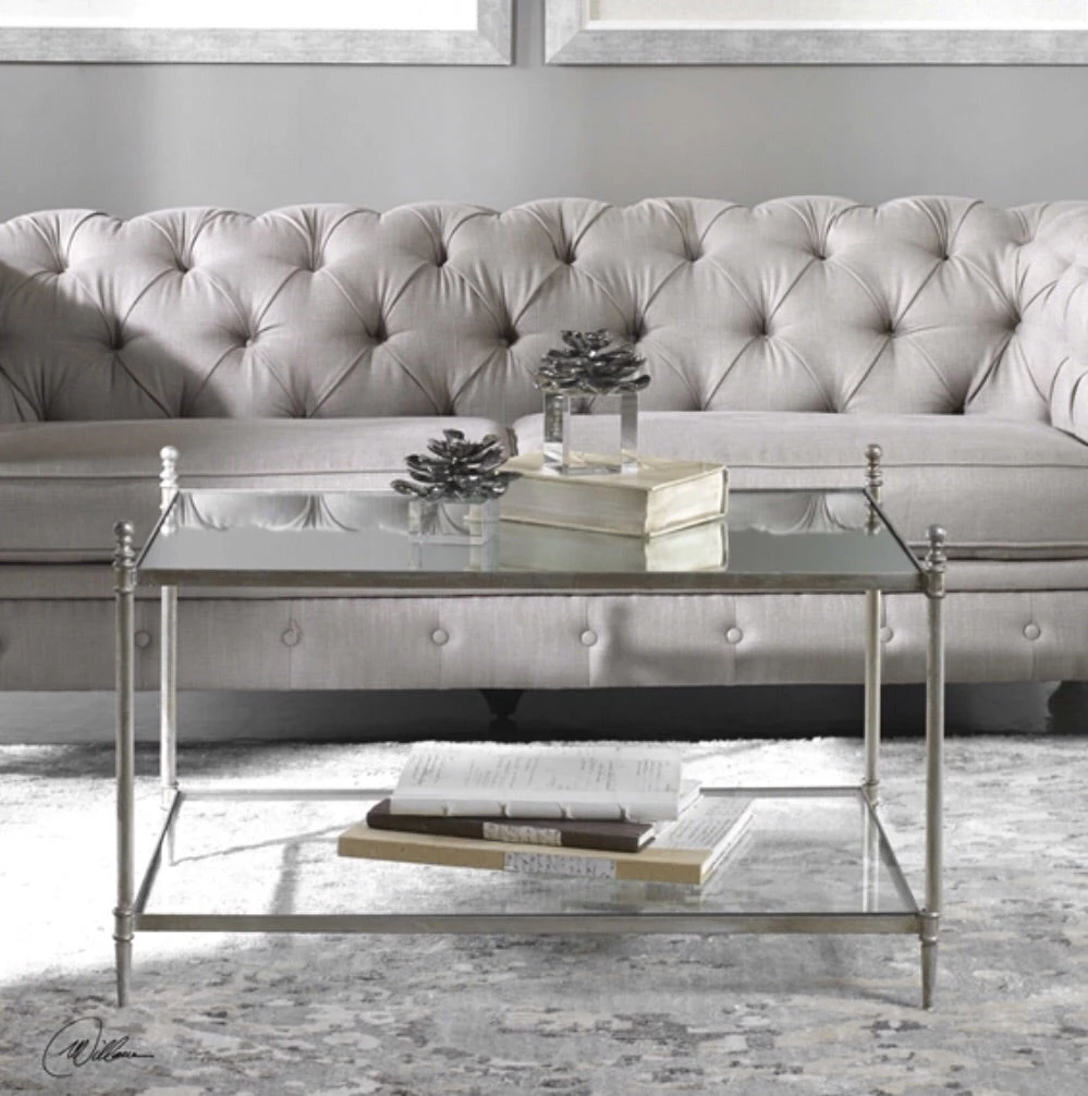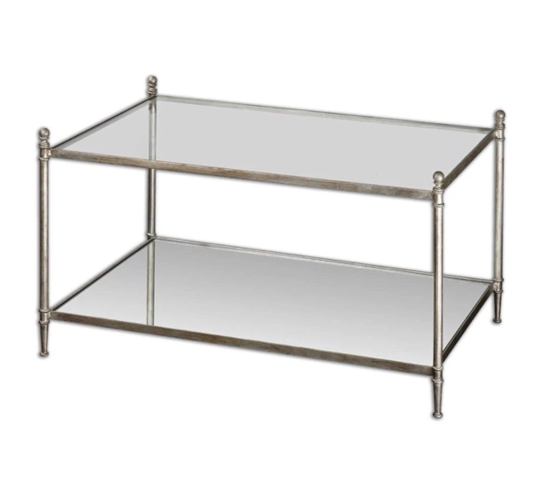 Forged iron frame in antiqued silver leaf with clear, tempered glass top and mirrored gallery shelf.