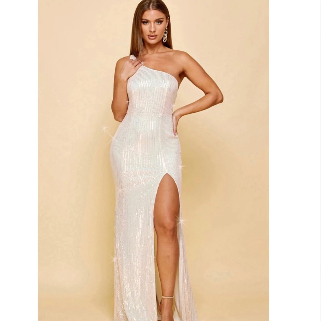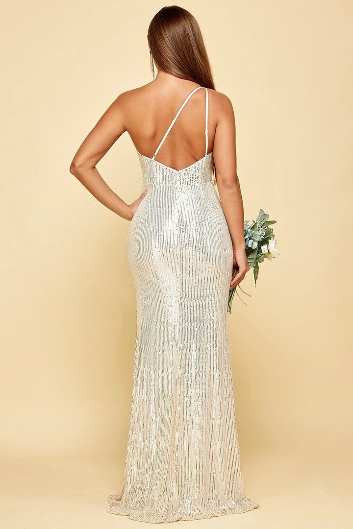 Description: – ONE SHOULDER SLIT SEQUIN MAXI