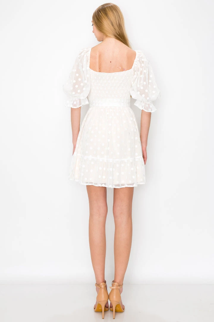 Polka Dot lace overlay mini dress with puff sleeves and tie waist