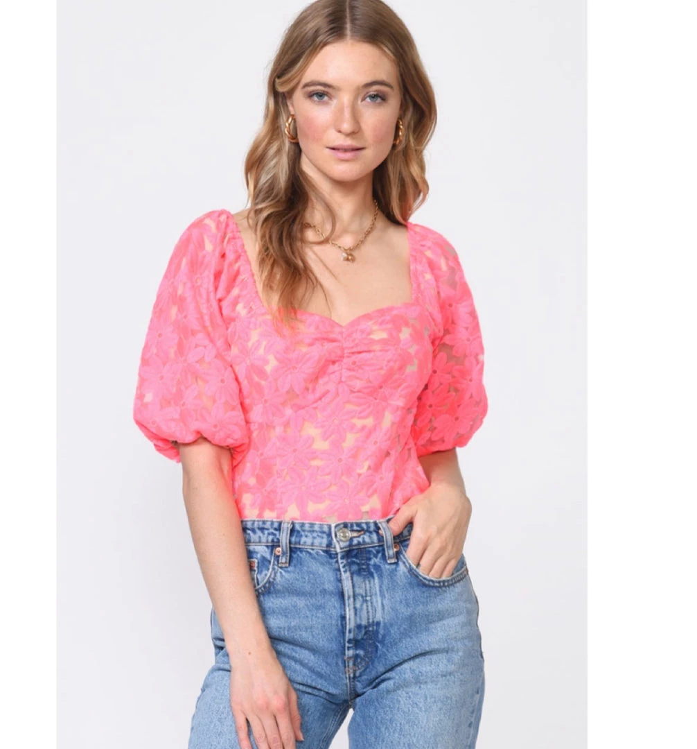This spring we’re not afraid to wear color. This top features neon pink embroidered flowers, sweetheart neckline, puff sleeves, and is lined in a contrasting fabric. Pair with your favorite denim for a fun pop of color.