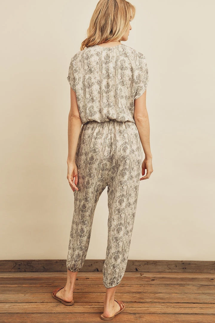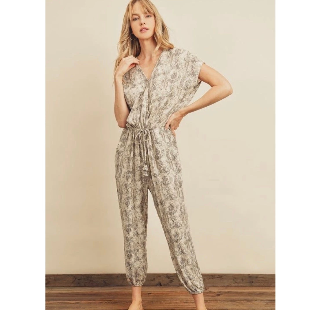Description: Boho print jumpsuit featuring a drawstring waist tie and elastic cuffs. Model is 5`9 and wearing size Small.