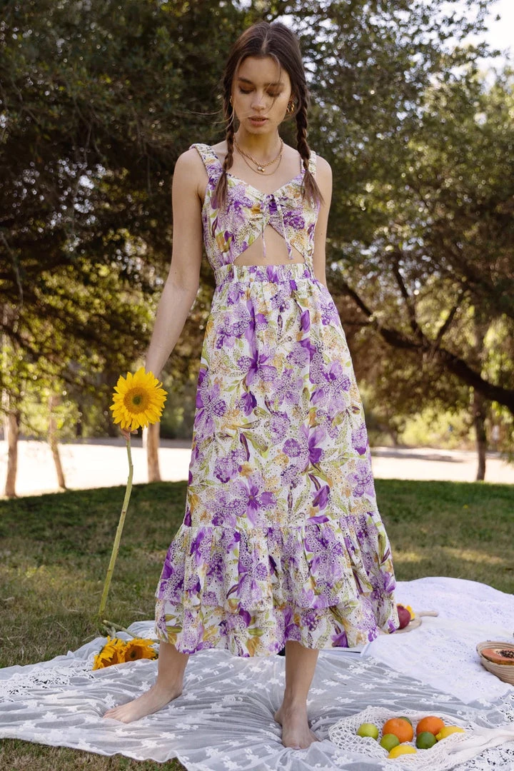 Get ready for a summer filled with romantic picnics in the Kathleene Embroidered Eyelet Cut Out Midi Dress. This dreamy midi dress is made of intricate eyelet embroidery in a beautiful floral print and features scrunchie straps, an elastic waistband, a small cutout along the front, and a flattering double ruffled hem. Invisible zipper closure along the back.