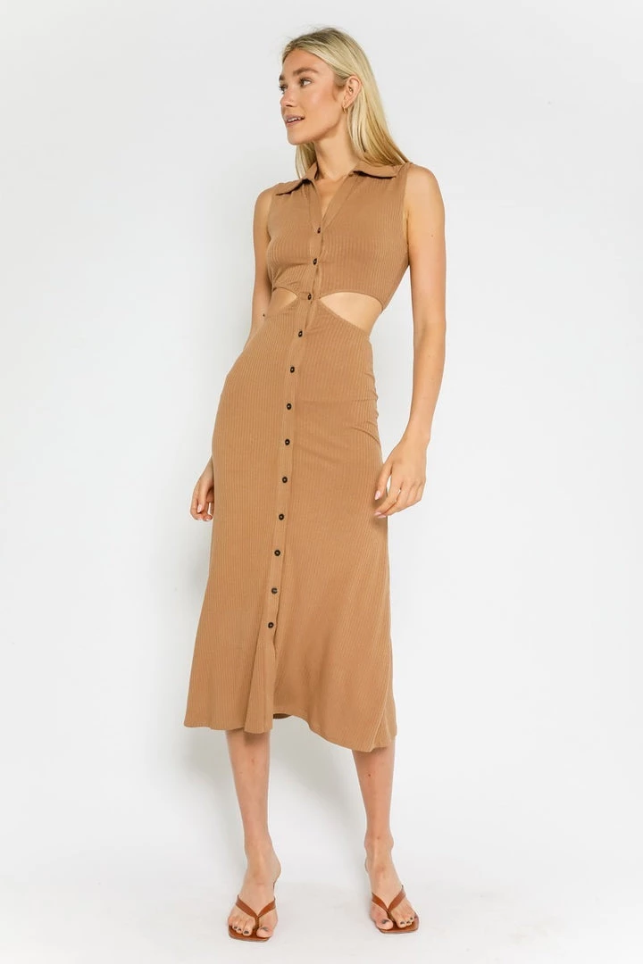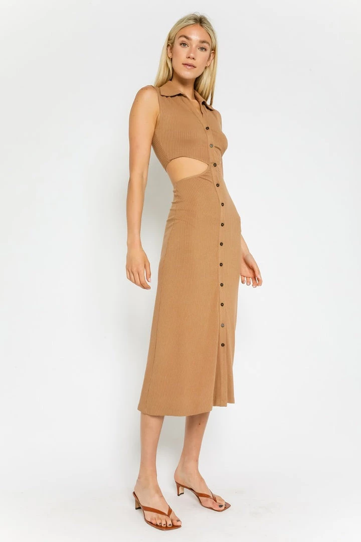 Description: Our Cut Out Midi Dress features a button up front and collared neck.