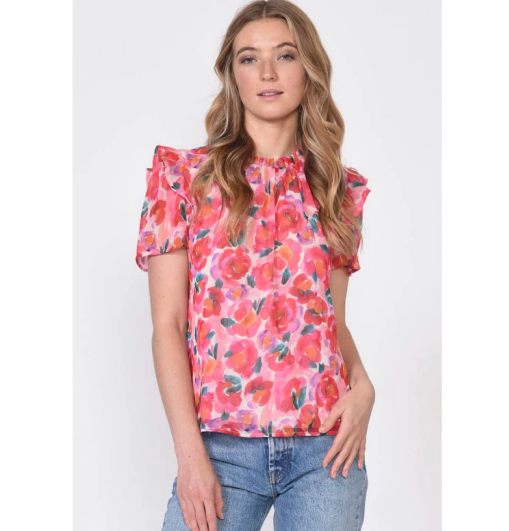 A romantic, breezy floral print blouse is designed with ruffle details along shoulders and neckline. Fully lined.
