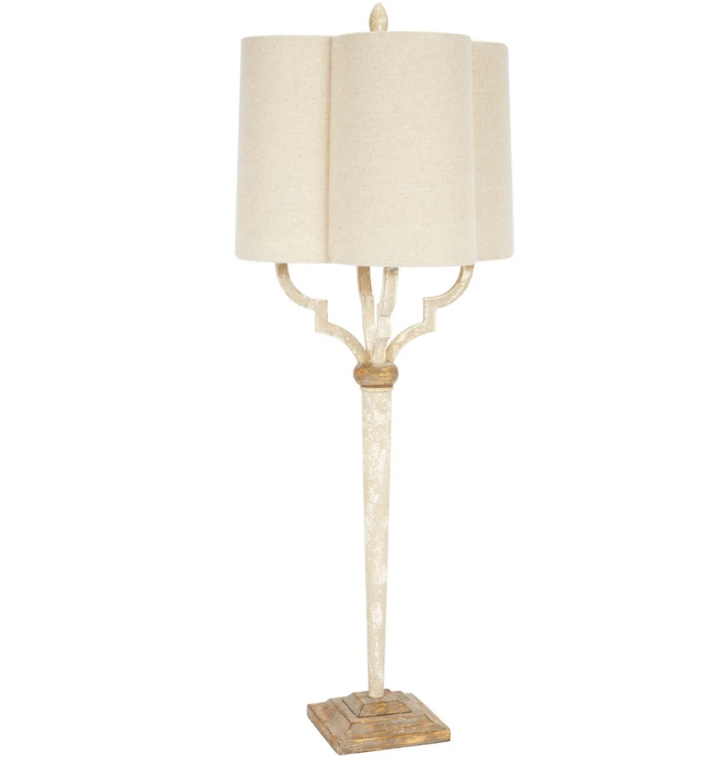 Indigo Boutique LEE FRENCH WHITE & GOLD QUATREFOIL BUFFET LAMP WITH SCALLOPED LINEN SHADE