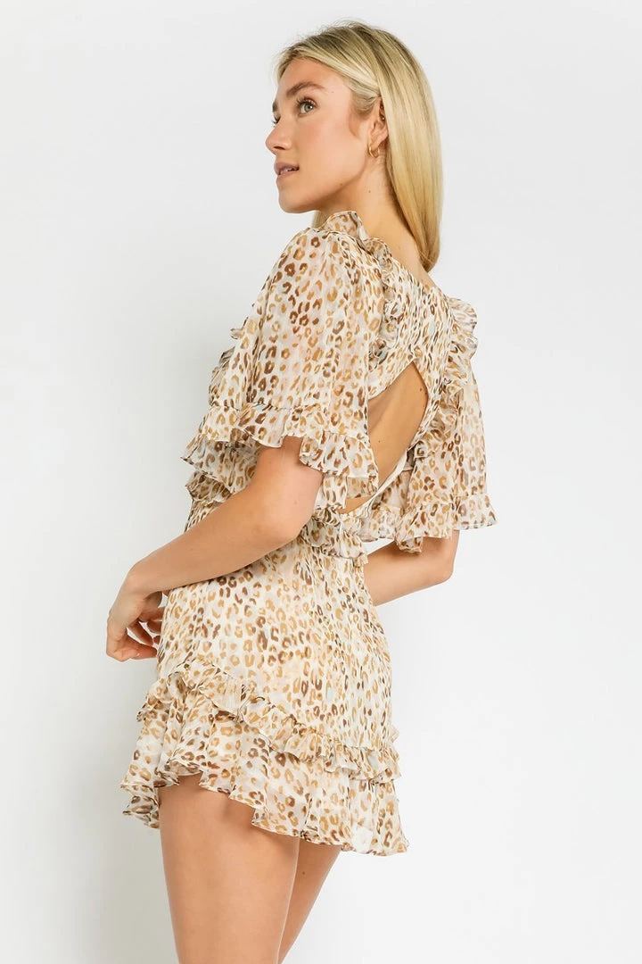 Description: Our Leopard Cutout Dress features ruffled trims and an open back.