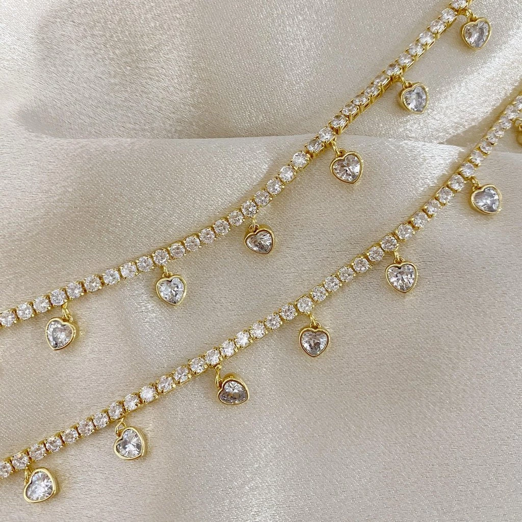 Sparkly tennis style necklace with cubic zirconia dangling mini heart accents.