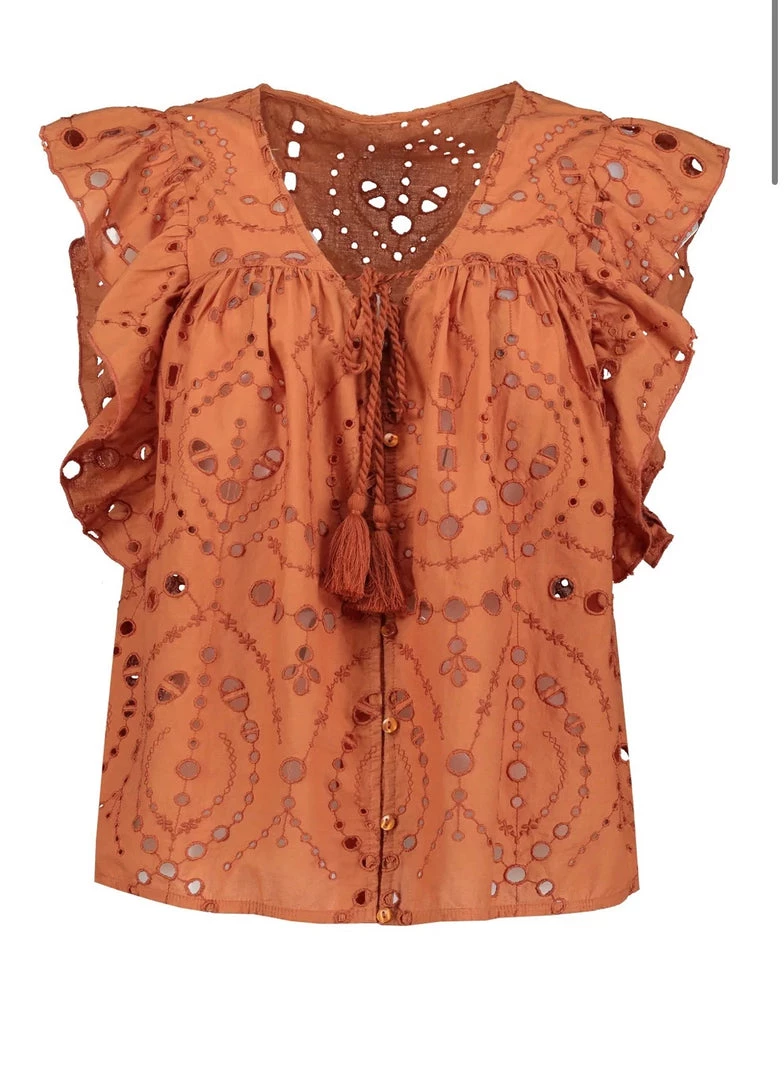 Meant for all your picture-perfect moments. This flutter sleeve top is crafted in a light and airy eyelet. It goes perfectly with jeans (or the matching ruffle mini skirt).