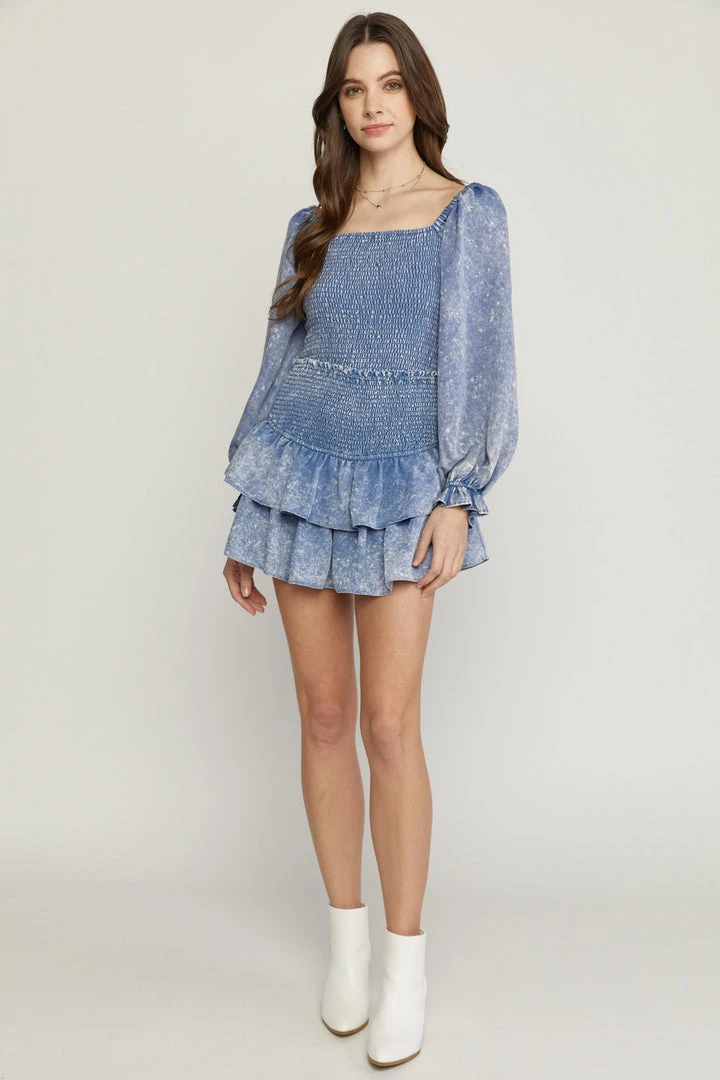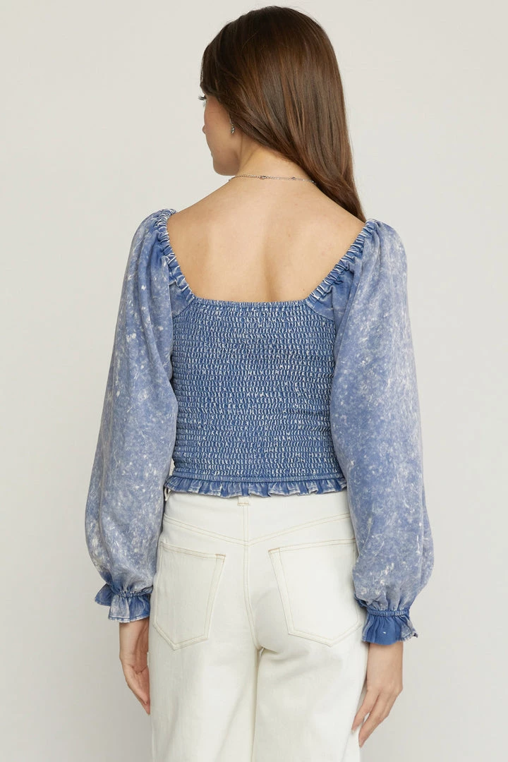 Acid wash square neck long sleeve cropped top featuring smocking at bust. Elastic at shoulder and wrists. Unlined. Woven. Non-sheer. Lightweight.