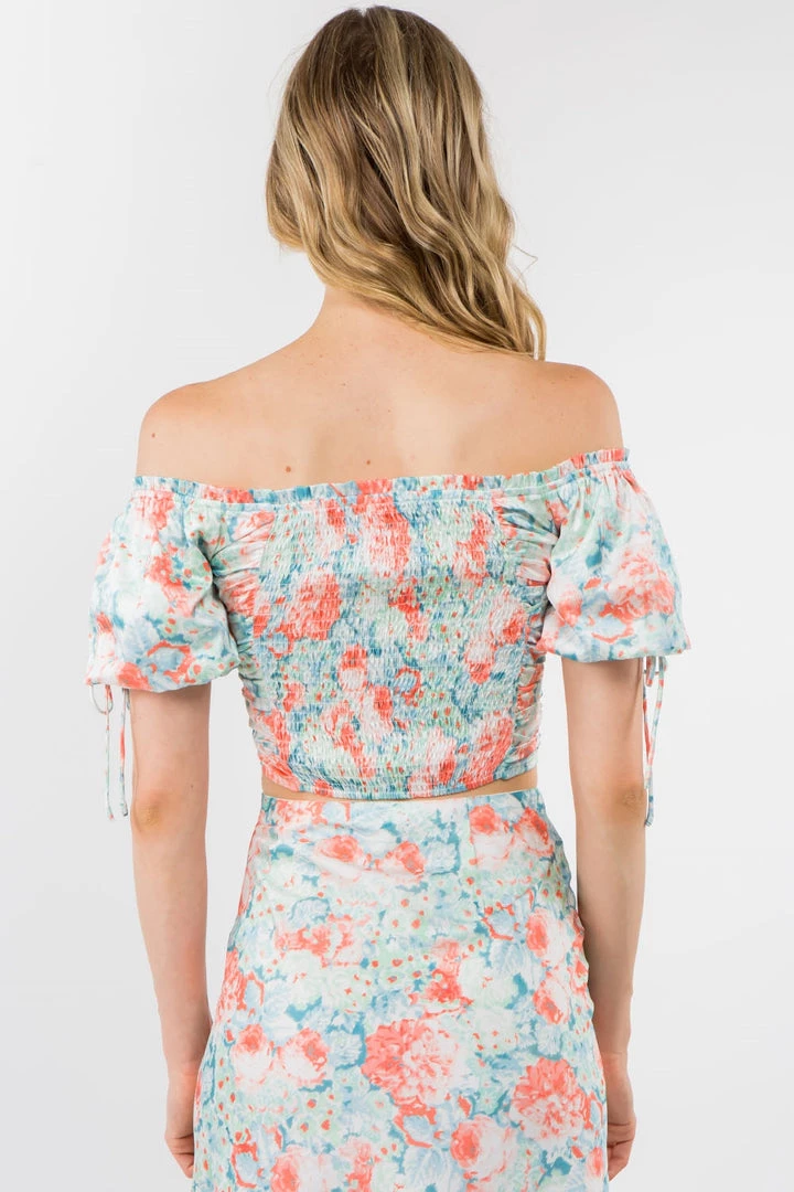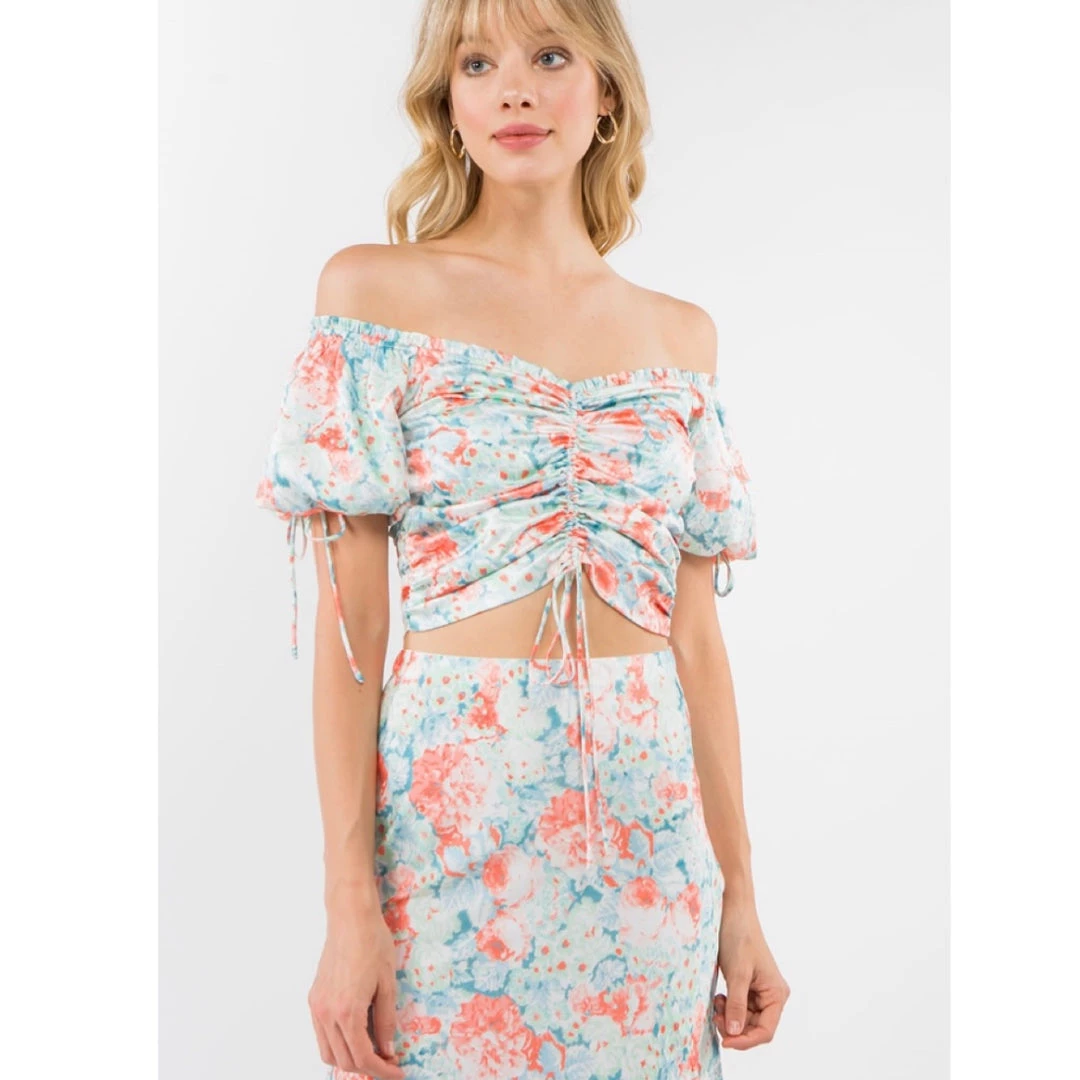 Ruched off the shoulder crop top with satin floral