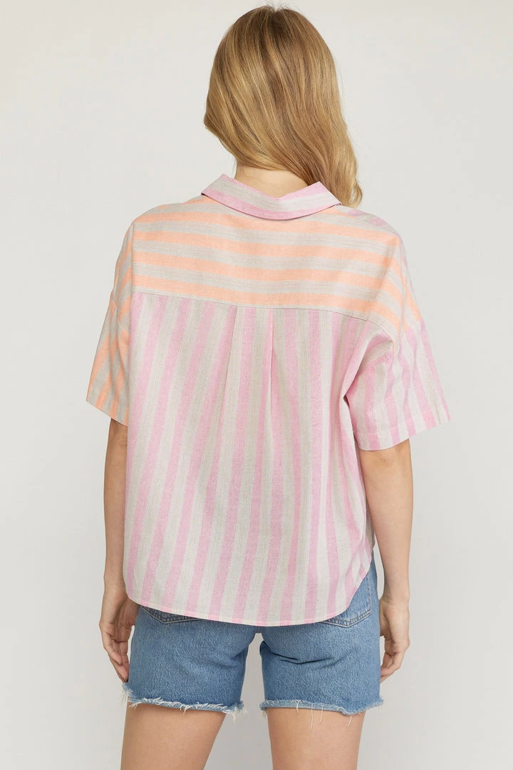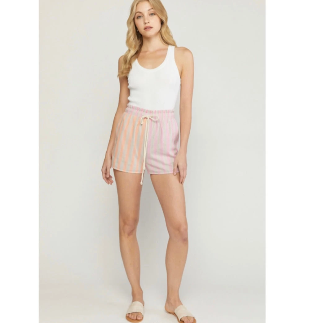 Stripe print high waisted shorts featuring drawstring closure at waist. Pockets at sides. Elastic waistband. Lined. Woven. Non-sheer. Lightweight.