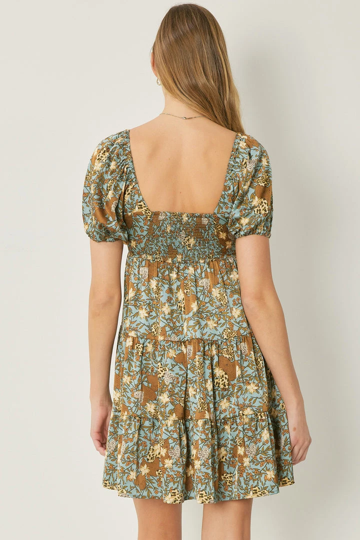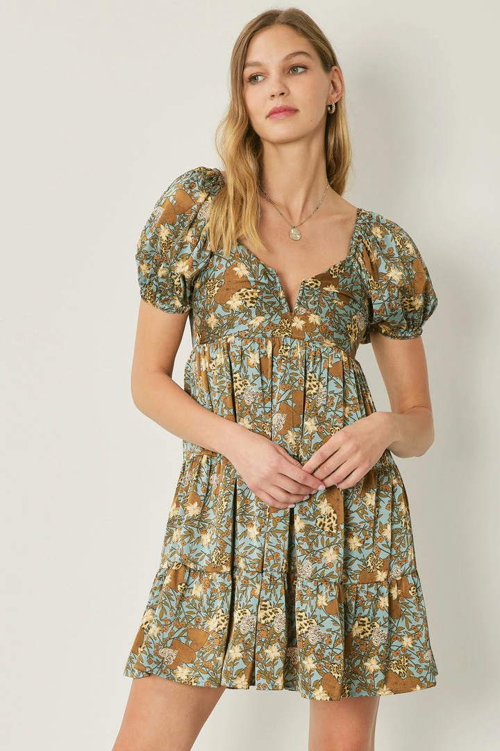 Satin floral print sweetheart neckline puff sleeve tiered mini dress featuring V-wire insert at front. Lined. Woven. Non-sheer. Lightweight