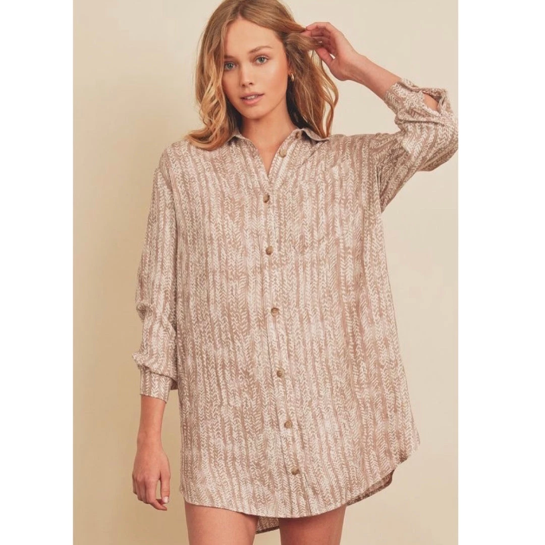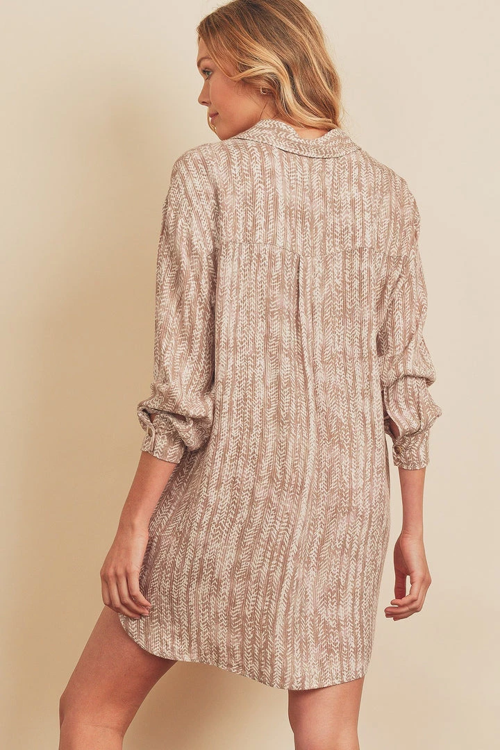 Description: Pattern print shirt dress featuring a collared neckline, high-low hem, and button closures. Model is 5`9 and wearing size Small.