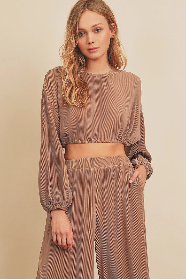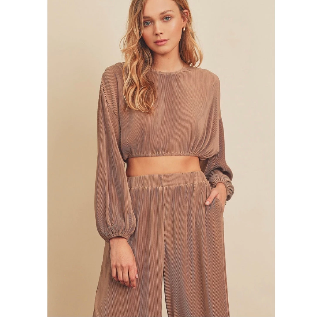 Description: Micro-pleated knit top featuring voluminous bishop sleeves and a cropped hem. Wear it as a set with FP7053, our Micro-Pleated Wide-Leg Pants (sold separately). Model is 5`9 and wearing size Small.