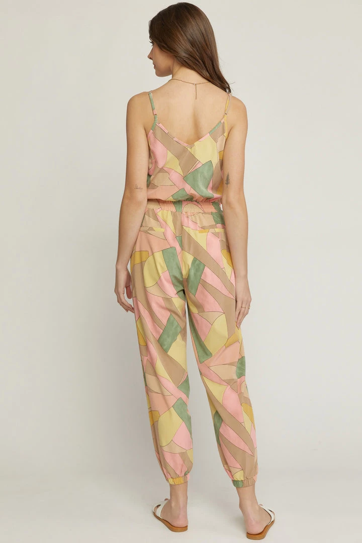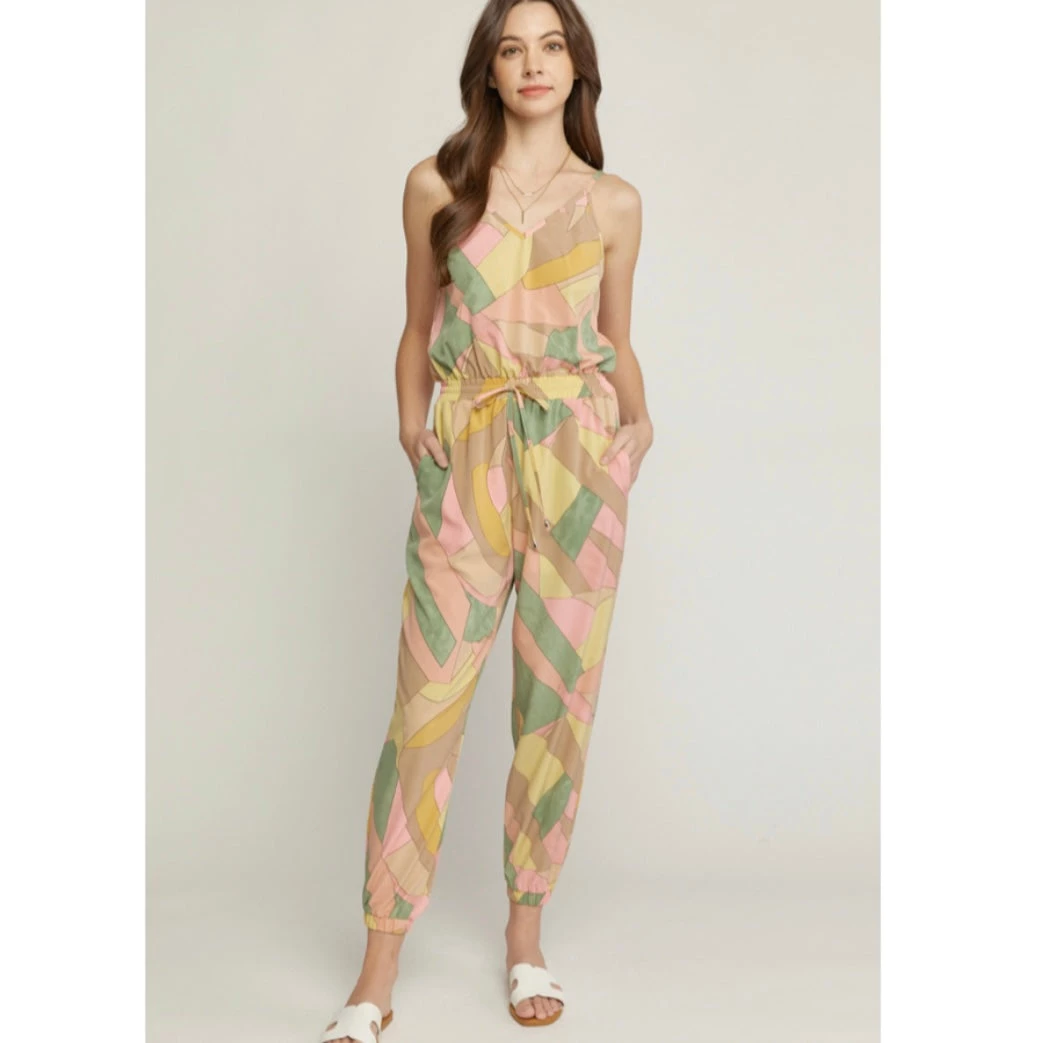 Printed v-neck sleeveless jumpsuit featuring self tie at waist. Pockets at sides. Elastic at waist and ankles. Adjustable straps. Lined. Woven. Non-sheer. Lightweight.