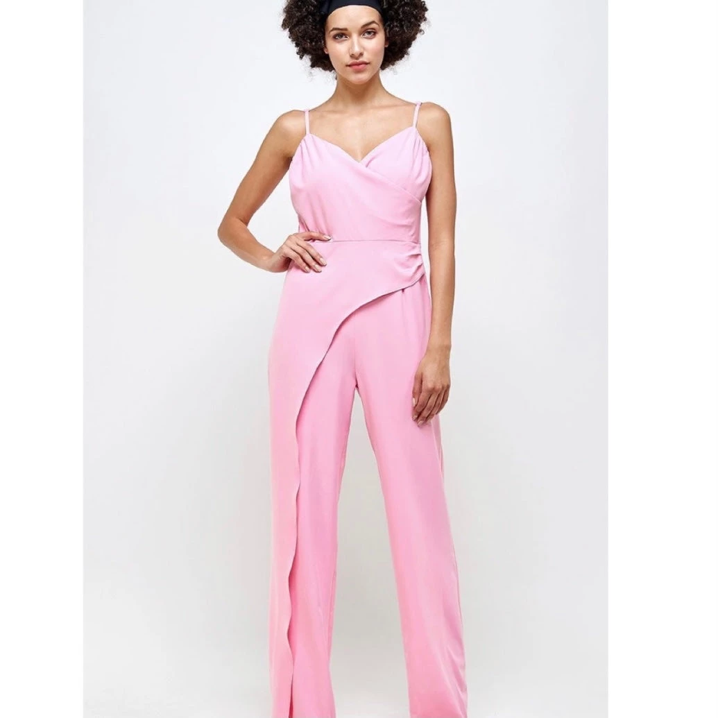 Description: Oneonesix label- Afifa pleat detail jumpsuit in stretch crepe fabric. This style features a lined surplice V neck, adjustable straps, asymmetric overlay at pants, straight wide leg, and hidden zipper closure at back.