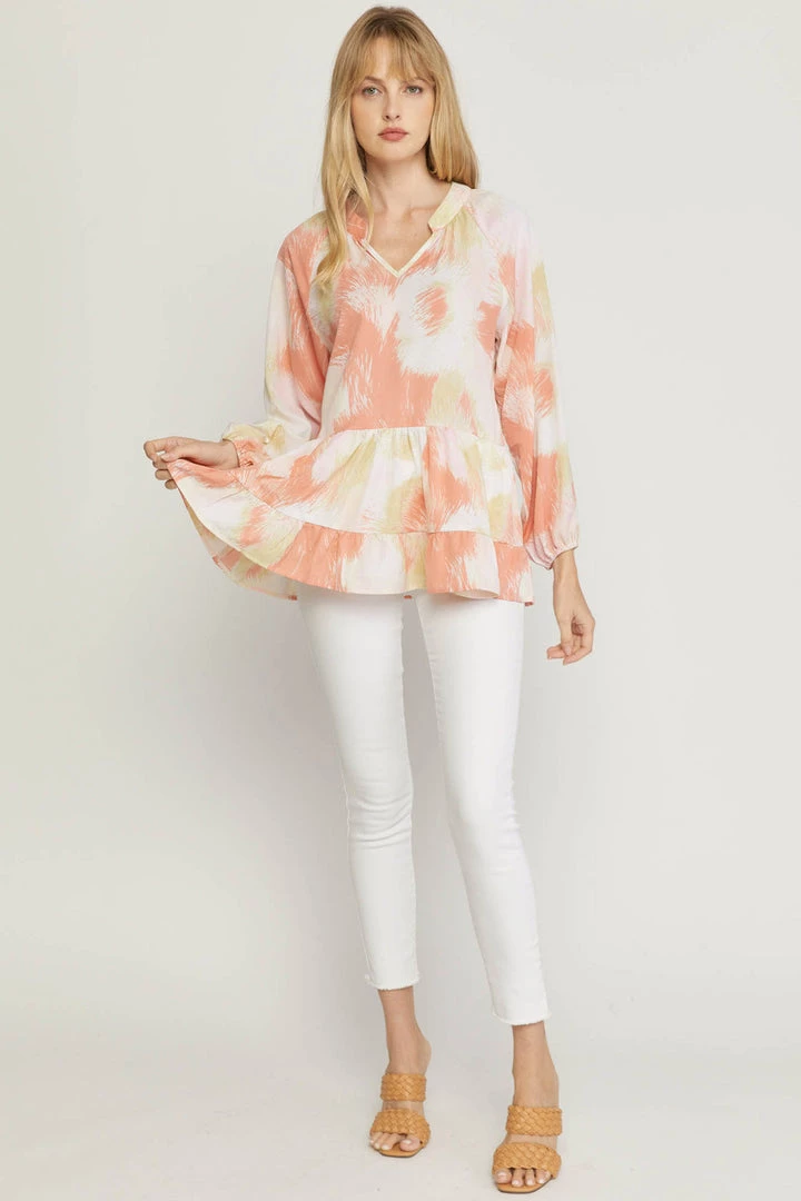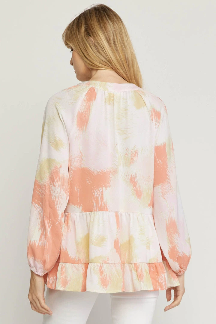 Printed v-neck long sleeve top featuring tiering detail. Unlined. Woven. Non-sheer. Lightweight.