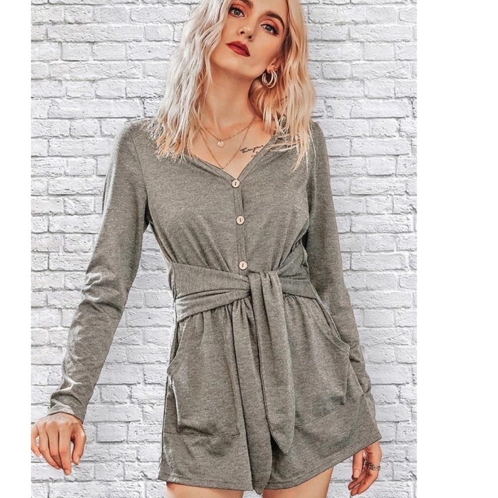 Features: V Neck, Button Down, Long Sleeves, Solid Color, Tie Waist, Ruffle, Casual