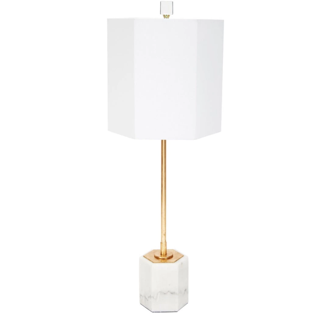 Indigo Boutique SCOUT HEXAGONAL WHITE MARBLE BUFFET LAMP WITH WHITE LINEN SHADE