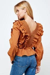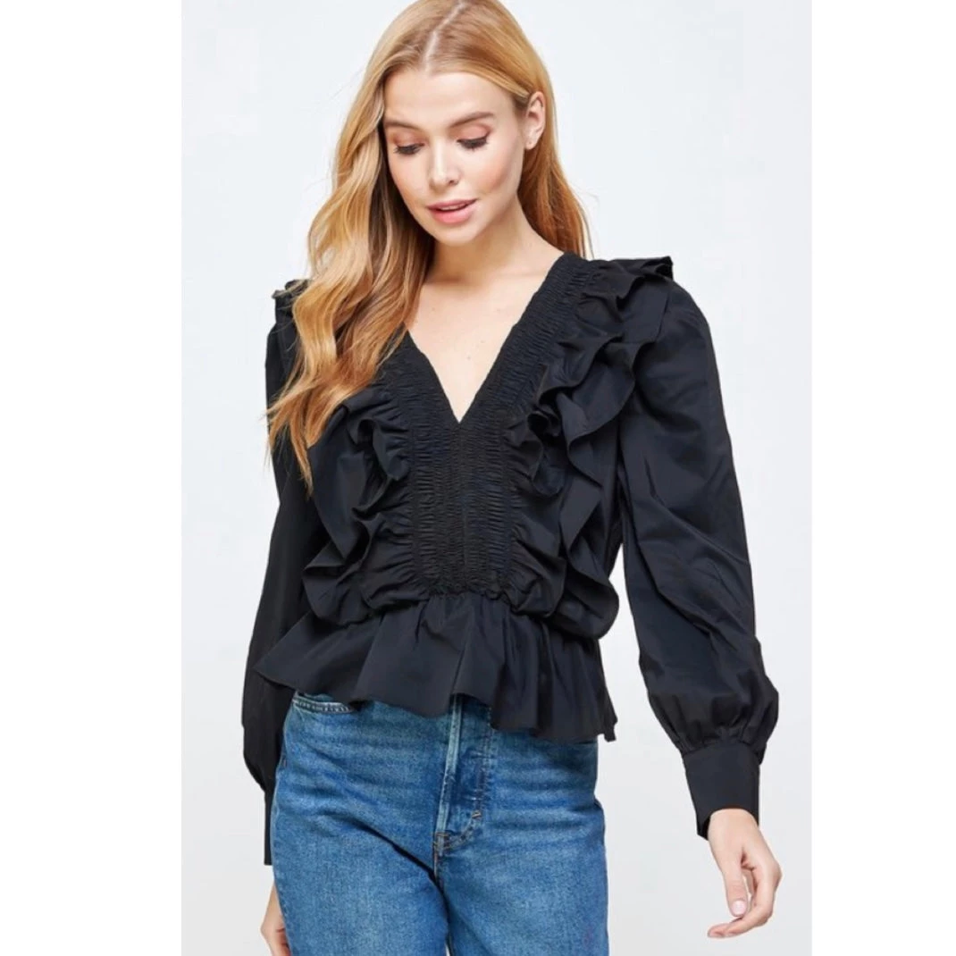 Description: Smocked ruffled long sleeve blouse in stretch cotton poplin fabric. This ruffles frill top features a classic front/back V neck, smocking detail at front/back, long sleeves with buttoned cuff and elasticated waist for flattering.
