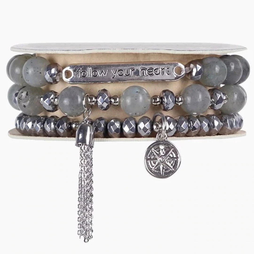 Follow your Heart-follow your heart and you will always find your way. This set is an encouraging reminder for yourself, friend, or loved one to follow their heart in life and on any new adventure. This stack features labradorite, which is a healing and protective stone.