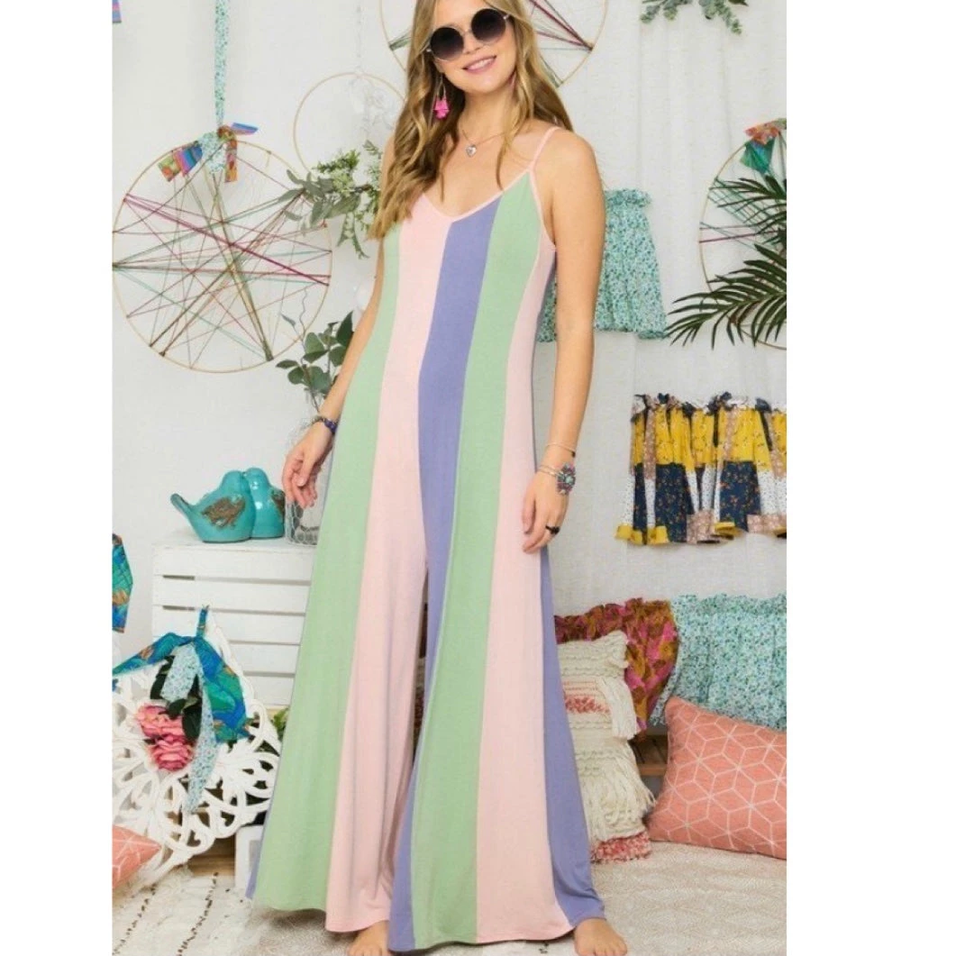 Description: THICK VERTICAL MULTI COLOR STRIPE JUMPSUIT