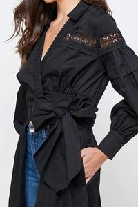 Description: Overlap tie front cover up in stretch cotton poplin fabric. This versatile jacket/robe/blouse features beautiful lace trim throughout, long puff sleeves with buttoned cuff, shirt collar, surplice V neck, and wrap construction with adjustable tie closure